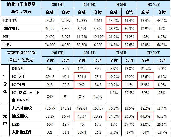 “以2011上下半年的成長幅度來看,預料2011下半年全球LCD TV、數碼相機、NB及手機,都將交出成長兩位數的好成績。,”拓墣產業研究所副所長楊勝帆表示,“其中LCD TV及數碼相機更分別較上半年大幅成長33.4%和28.8%。而臺灣業者受惠于國際大廠委外代工訂單挹注,及HTC力拼手機出貨量倍增等因素,四大消費電子產品之成長幅度皆優于全球。”