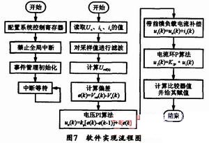 筆者設計了一臺1kVA的逆變電焊電源實驗樣機,其系統的核心控制器是TI的DSP芯片TMS320LF2407A。TMS320LF2407A是一款高性能16位數字信號處理器,是TI公司定點DSP2000系列中的一員,它是專門為控制與運動控制的數字化實現而設計的。該DSP可完成逆變器輸出電壓頻率的控制、負載電壓和電流取樣、開關管的導通關斷時間控制等。其軟件實現流程圖如圖7所示。