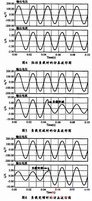 圖4給出了在輸入電壓為200V,額定負載分別為ZL=100Ω時的輸出電壓和輸出電流仿真波形;由圖4可見,輸出電壓頻率均能穩定在50H z;圖5所示為負載突減時的仿真波形,其中突變部分是負載ZL=20Ω切換到ZL=40Ω時的輸出電壓、電流仿真波形;圖6為負載突增時的仿真波形,其中突變部分是負載ZL=40Ω切換到ZL=20Ω時的輸出電壓、電流仿真波形;通過以上仿真波形圖可知,該系統工作穩定,靜態誤差小,并具有很強的魯棒型,同時,這種電流內環電壓外環的雙閉環控制的動態響應速度非???,因此可見,用該方法對該系統控制電路進行設計是有效而可行的。