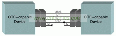 在標準 USB 中,主機上的插孔被稱作“A”連接器,而外圍設備上的插孔被稱作“B” 連接器。由于目標終端設備主要為一些小型移動消費類電子產品,因此標準“A”插孔對這些產品來說過大。按照 OTG 規范的原始版本,這些新型連接器被稱作“迷你”連接器。隨后,對該規范進行了修改,以強制規定 OTG 設備的“微型”連接器。特別是,OTG 設備必須實施一個微型 AB 插孔。這種 AB 名命表示其為批量安裝在某個單一設備中的“A”和“B”插孔。該微型 AB 插孔可以插接微型 B 插頭或者微型 A 插頭。問題似乎很清楚:如果您插一個微型 A 插頭,則設備會為一個主機;如果您插一個微型 B 插頭,則其為一個外圍設備。但是,基于微型 AB 的產品如何知道插入的是什么呢?OTG 規范給標準 USB 系統的四個觸點又增加了一個觸點,稱作 ID。由于 ID 引腳不在標準 USB 連接中,因此規范保留了這一點,并在 ID 引腳上定義了一個無連接,作為初始外圍設備。反過來,如果 ID 引腳接地,則設備扮演初始主機角色,如圖 1 所示。