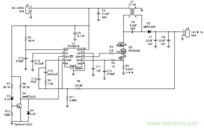 我們構建起如圖1所示電路,并對其進行描述。該電路可在汽車市場獲得應用。這里,其擁有一個8V到36V的寬范圍輸入,可以為穩定12-V輸出以上或者以下。汽車市場更喜歡使用陶瓷電容器,原因是其寬溫度范圍、長壽命、高紋波電流額定值和高可靠性。結果,耦合電容器(C6)便為陶瓷的。這就意味著,相比電解電容器,它擁有較高的AC電壓,同時這種電路會對低漏電感值更加敏感。