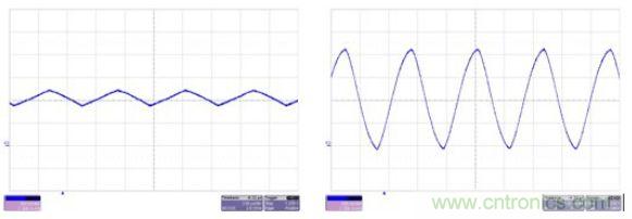 該電路中的兩個47uH Coilcraft電感分別為:一個非常低漏電感(0.5 uH)的MSD1260,以及一個較高漏電感(14 uH)的MSC1278。圖2顯示了這兩個電感的一次電流波形。左邊為MSC1278電感的輸入電流(流入L1的引腳1),而右邊為MSD1260輸入電流波形。左邊的電流為一般情況。電流主要為其三角AC分量的DC。右邊的波形為利用耦合電感的高AC電壓以及一個低漏電感值所得到的結果。峰值電流幾乎為DC輸入電流的兩倍,而RMS電流比高漏電感情況多出50%。