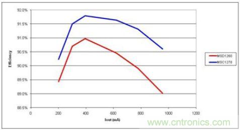 圖3 由于更少的電流,高漏電感(MSC1278)產生更高的效率