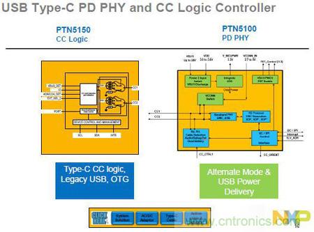 不同的應用場景,不同的復雜度層次,NXP有不同的產品和方案來搭配,為設計者提供達到系統最佳化的方案。下圖中展示了NXP的CC邏輯控制和PD PHY方案。吳韶阡介紹說,如果是低于15W的供電,或者是不需要支持多功能的設計,可以采用簡單的CC邏輯控制;而一個完整的USB Type-C方案就需要使用完整的PD方案,相應的元器件也會增加。
