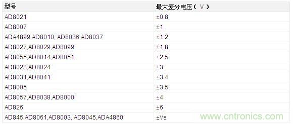 為了解決這一問題,首先盡量選擇具有較高差分電壓額定值的放大器。遺憾的是,放大器的選擇可能還會考慮其他諸多參數(但差分輸入保護不是其中的參數)。放大器數據表中絕對最大額定值的選擇通常表明其最大差分輸入電壓。如果性能指標小于±Vs,則提供某些內置輸入保護。電壓越低,電路表現出截止狀態隔離度的可能就越大。表1給出所選放大器的差分電壓額定值。