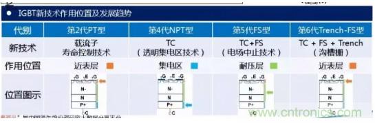 1)IGBT縱向結構:非透明集電區NPT型、帶緩沖層的PT型、透明集電區NPT型和FS電場截止型;2)IGBT柵極結構:平面柵機構、Trench溝槽型結構;3)硅片加工工藝:外延生長技術、區熔硅單晶;