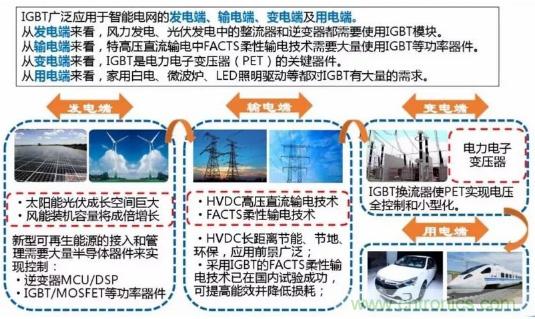 IGBT廣泛應用于智能電網的發電端、輸電端、變電端及用電端: