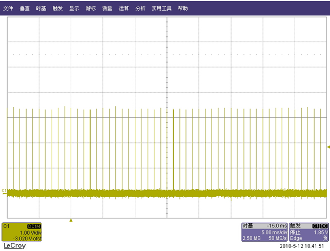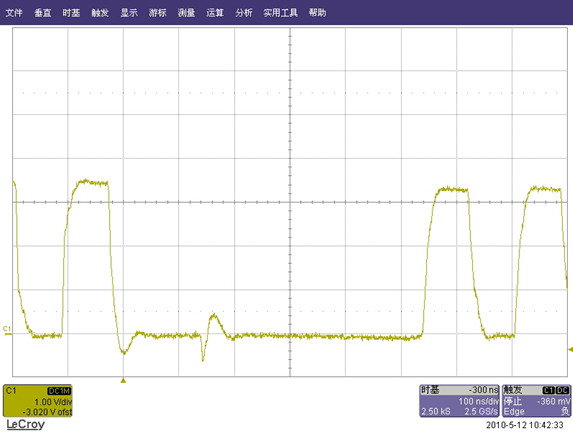 由于這些通信數據量的加大是突發出現的,用手動抓到的突發數據量波形很難剛好在時基觸發點附近,這樣波形放大后我們需要觀察的區域可能會無法滾進屏幕里,即使能滾進屏幕里,放大后的波形也可能由于時基、采樣等原因而失真的比較嚴重。而在一般情況下,我們都是考慮把觸發電平設置在如下圖“正統”的波形范圍里,但這樣也就抓不到“飛鳥”了: