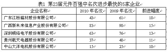 金融危機造成的企業經營上的波動都反饋到了第22屆、23屆元件百強的榜單上。在近兩屆的榜單之中,均有20多家企業的名次出現了10位以上(含10位)的較大波動,去年23家,今年21家。據估計,如果國際國內的經濟形勢能保持穩定,在未來一兩年內,元件百強榜單中,名次出現大起大落的企業數量將會減少。
