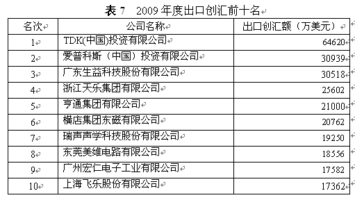 對于中國電子元件行業的外貿出口來說,2009年是一個從谷底緩慢爬升的過程。本屆元件百強中出口創匯總額為52.48億美元,同比下降10.38%,占銷售收入總額的28.81%,與上屆元件百強的出口總額相比,下降了9.83%。由于金融危機導致了外需萎縮,而且我國刺激內需的各項政策效果明顯,一些元件百強企業開始更多地關注國內市場,所以本屆元件百強的出口創匯額雖然下滑,但整體銷售收入仍然獲得增長。