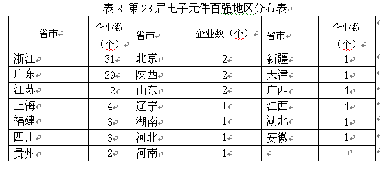 新一屆元件百強的地區分布格局并沒有出現大的變化,100家企業分布在我國20個省、市、自治區。浙江、廣東、江蘇三省仍然是元件百強企業最為集中的地方,企業數分別為31家、29家和12家。長三角地區的江、浙、滬三省市以47席幾乎占據元件百強企業的半壁江山。
