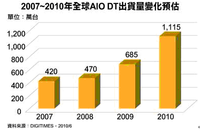 平價一體式桌上型計算機(All In One PC;AIO PC)在2009年創下685萬臺,成長45.7%后,DIGITIMES Research預估2010年將進一步提高至1,115萬臺,成長62.8%,展現新興產品的強勁成長力道。