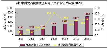 2005-2009年,中國大陸便攜式醫療電子產品市場呈現出加速增長勢態,年復合增長率高達30.8%,幾乎沒有受到金融危機的影響。2009年市場總規模達到25.12億美元,增長速度達到25.8%占醫療電子產品總市場的53.2%。在便攜式醫療電子市場中,家用的占六成以上的份額,電子血壓計、便攜式血糖儀和電子助聽器占據了90%以上的銷售份額。由于目前市場處于普及的初級階段,中國人口基數大,國人健康意識的提升,整個便攜式醫療電子市場需要面對的是中國內需市場,不存在市場飽和所謂的受金融危機影響。所以家用便攜式醫療電子產品市場前景非常好,便攜式、信息化、低功耗、低成本以及安全性是市場關注的熱點。展望未來,中國便攜式醫療電子市場前景非常誘人,在未來兩年,中國便攜式醫療電子產品市場規模年復合增長率可接近30%,2010年市場規模將接近32億美元,2011年會超過40億美元。(見下圖)。