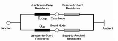 這樣就可以根據公式RJX=(TJ-TX)/Ploss求出結點到環境的熱阻RthJA(RthJA=RthJS+RthSA)。有關RthJA的計算,這里只介紹一種簡單的熱模型(Compactthermalmodel)2R模型,即Two-ResistorModel。其理論依據如圖4所示。
