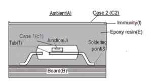 圖5中陰影部分為硅膠、樹脂等灌封料,其作用主要有兩個:一方面用于固定半成品;另一方面用于傳導功率器件表面的溫度(散熱)。所以從結點到環境的熱阻RthJA就可以表示為: