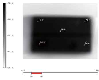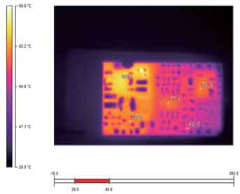 圖6~9是利用Ti20拍攝的金升陽公司12W產品的熱圖像。通過這些圖片,我們不僅可以清晰地看出整體的熱分布(相同的溫度,所用的顏色是一致的),還可以借助其提供的軟件分析每一個元器件此時對應的溫度值,如幾個溫度相對較高的元器件的溫度值分別如表1所示。