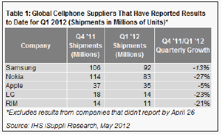 據IHS iSuppli公司的DRAM市場簡報,爾必達第一季度營業收入比2011年第四季度增長1%,占據大約12.6%的市場份額,排名升至第三。雖然其增長幅度可能顯得很小,但爾必達的表現優于整體DRAM市場。第一季度整體DRAM市場的營業收入為62億美元,比2011年第四季度的65億美元下降4%,如表1所示。爾必達的表現也優于緊隨其后的美光。美光的第一季度營業收入環比下降3%,排名下降一位至第四。