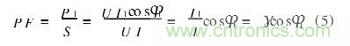 2) 若系統輸入電壓為標準的正弦波,僅有基波分量,即有效值電壓為基波電壓,輸入電流是非正弦信號,即包含基波分量,又含有其它高次諧波。電流基波分量的有效值可視為基波分量的有功分量和無功分量的正交合成φ1為輸入電壓與輸入電流基波之間的相位角。故P = UI1cosφ1,代入式(4)得