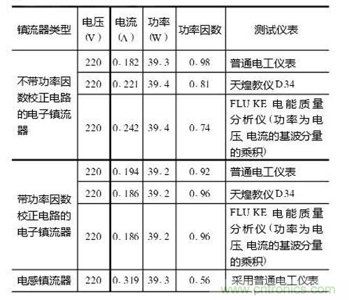 筆者用不同的儀器對不同品牌40W電子鎮流器啟動的熒光燈和電感鎮流器啟動的熒光燈做了實驗,其測得的數據如下表: