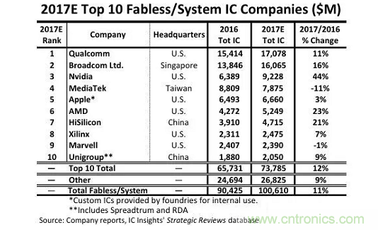 目前看來,紫光展銳現在已經是一個擁有4500員工、年營收超過100億元、中國第一、世界第三(僅次于高通和聯發科)的芯片設計公司。在ICinsights最新公布的數據里,紫光展銳也是排名世界第九的無晶圓廠,這是國內除海思外,唯一入選的企業。多方面的數據證明,紫光展銳已經在芯片世界擁有了不小的名頭。