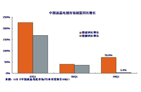 GfK中國發布的《液晶電視產業市場季度報告(09Q1)》顯示:2009年1季度,中國液晶電視市場出現了反彈,銷量達到476萬臺,比2008年1季度增長了約70%。