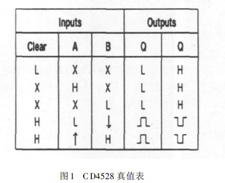 CD4528含兩個單穩態觸發器,其真值表如圖1。芯片3腳與13腳分別為其內部兩個獨立單穩態電路的Clear 端,5腳和11腳為單穩態的B輸入端,4腳與12腳為單穩態的A輸入端。B端接高電平,只有當Clear端為高電平時,A端輸入的上升沿觸發才會有效。