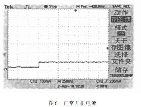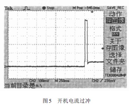 開機時,由于電源濾波電容大,以及各延遲環節使得電流采樣反饋值與給定值在調節器輸入端不同,這會使得負載電流上升過沖,實測過沖波形如圖5所示。 為了解決這一問題,可以將調節器給定端RC 的值適當加大,調節以后的開機電流沒有發生過沖,波形如圖6.