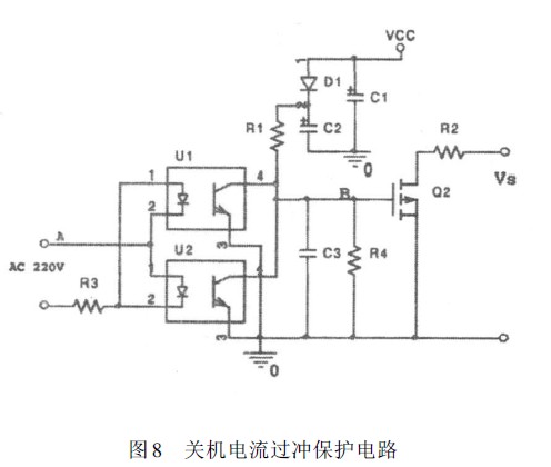 圖8 為關機電流過沖保護電路,該電路能在3ms內迅速檢測出交流電源是否關閉,并且在電源關閉后強行將調節器給定輸入端的電壓拉低,防止電流過沖,具體動作過程如下。