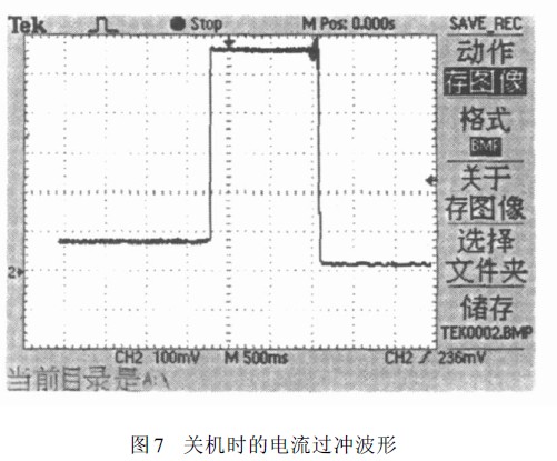 在我們設計的30A/20V開關型穩流電源中,采用控制電路單獨供電。主電路的濾波電容在工作時存儲了大量的電能,切斷總電源后,其中存儲的電荷持續數秒才能放完。 所以關機后單獨供電的采樣電路先關而主電路延遲關閉。調節器的給定輸入端由主電路供電,即關機后調節器的采樣輸入端先降低,給定端緩慢降低,于是其輸出誤差電壓增大,控制芯片增加PWM 的占空比,由此導致了關機時負載電流的嚴重過沖,過沖時的電流波形如圖7所示。