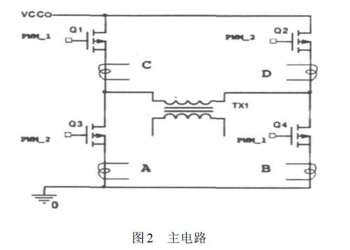 PWM1與PWM2為PWM芯片輸出的兩路互補脈沖信號,主電路(見圖2)中Q1、Q4的驅動與圖3中PWM1同步,Q2、Q3的驅動與PWM2同步。 在A、B、C和D4點進行電流上升率采樣然后轉變為電壓信號,并分別給圖3中的直通信號1與直通信號2。