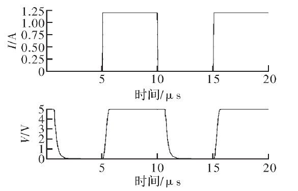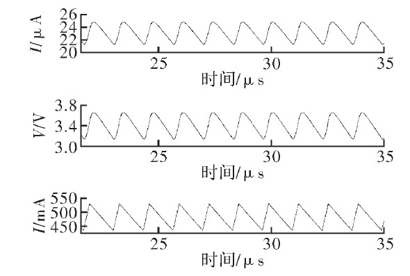 為驗證文中提出的電流采樣電路的功能,結合滯環控制電路及外部負載在Cadence中進行了仿真。圖5為輸入電壓20 V時采樣電流、電壓與負載電流的關系。由圖可見,采樣電流與采樣電壓隨負載電流同相周期性變化,周期約為1.2μs.