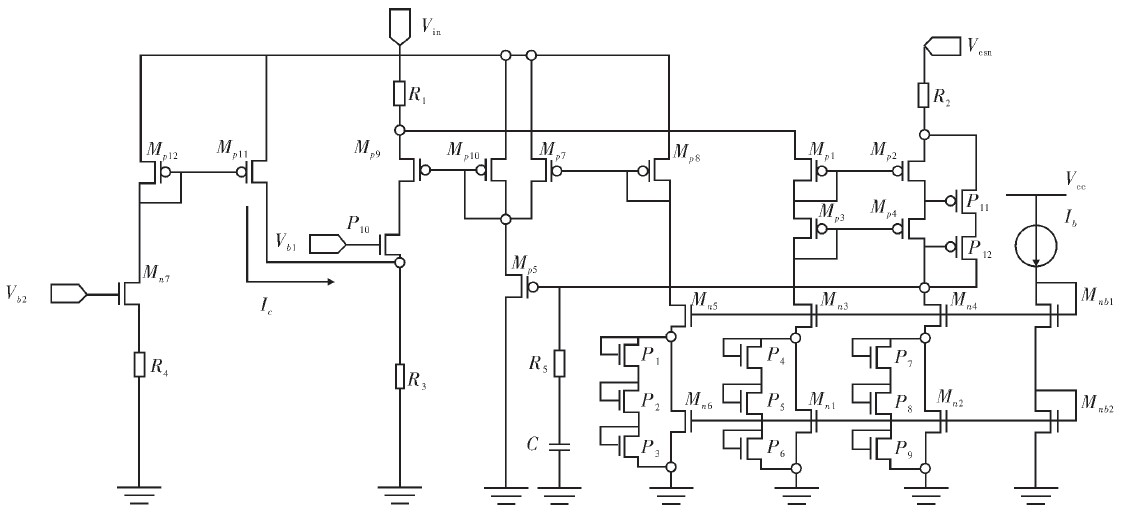 為使低壓管能在高壓輸入中也正常工作,電壓鏡采用了高低壓器件混用的共源共柵結構。Mp1、Mp2、Mn1和Mn2為低壓管;Mp3、Mp4、Mn3和Mn4為高壓管。一方面,高壓管作為共源共柵器件增大了輸出電阻;另一方面,它承受了大部分壓降,以保護低壓管不被擊穿。不過,共源共柵結構帶來另一個問題。串聯電阻R2令Mp2和Mp4之間的次極點更靠近原點,使系統變得不穩定。為消除該極點帶來的影響,在共源共柵結構的輸出端加入補償電阻R5和電容C,引入一個零點并使主極點更低。