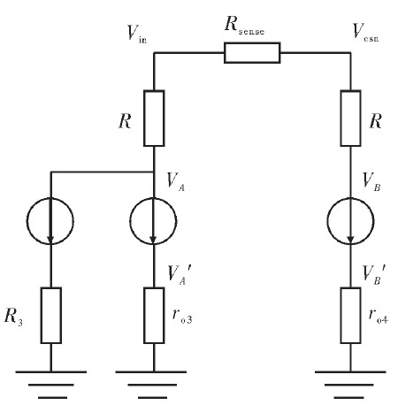 在實際電路中,VA對VB的匹配度直接影響采樣精度。圖3為簡化的小信號模型。圖4為實際電路圖。Vin與Vcsn為精確采樣電阻Rcsn兩端電壓,輸入范圍8~40 V;Vcc為芯片內部5 V穩定電源。