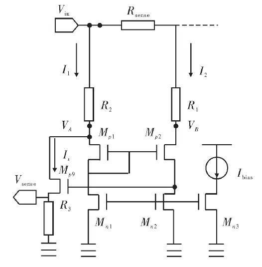 圖2是電路采樣電路結構圖。Rsense為采樣電阻,R1=R2=R;Mp1、Mp2、Mn1、Mn2組成的電壓鏡和Mp9反饋管組成匹配電流源作為電流檢測電路。其中Mp1與Mp2相互匹配并被偏置在飽和區,Mn1與Mn2是兩個相同且非常小的電流源,以保證流過Mp1與Mp2的電流相等從而使其具有相等的VSG。