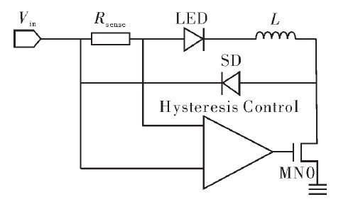 圖1是滯環控制電路框圖。LED驅動電流的變化反映在Rsense兩端的壓差變化上。滯環電流控制模塊內設兩個電流閾值Imax和Imin,當電路接上電源時,功率管打開,電源通過Rsense、負載LED向電感L充電,驅動電流上升。當電流>Imax時,控制電路輸出低電平關閉功率開關管。此時電感通過負載LED、Rsense和肖特基二極管放電,電流下降。當驅動電流<Imin時,控制電路輸出高電平打開功率開關管,重復上一個周期的動作。通過這種方式控制電路將驅動電流限制在Imax與Imin之間周期性變化,使流過LED的平均驅動電流值恒定。