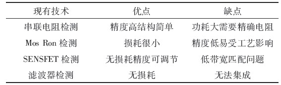 表1中列出了現有的幾種電流檢測技術并列舉了其優缺點。