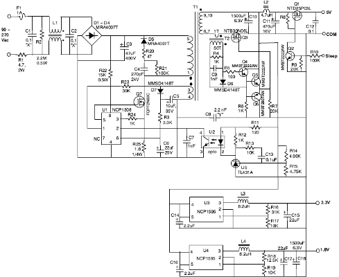 本文介紹的參考設計采用通用交流輸入,提供5.0 V、3.3 V和1.8 V輸出,能效高于72%。只要簡單改變3.3 V和1.8 V輸出上的檢測網絡,也可以提供其它輸出電壓。如果需要“休眠模式”的話,該設計也提供抑制5 V輸出的選項。此電源的主轉換器使用安森美半導體的NCP1308電流模式控制器及1個外部MOSFET,采用準諧振(QR)反激拓撲結構設計。5 V輸出采用1個同步整流MOSFET,而2個較低電壓輸出轉換器采用工作在1 MHz頻率的NCP1595單片同步降壓穩壓器來實現。5 V輸出還充當2個降壓穩壓器的直流源。這種特別的元件組合提供了一種簡單但有效的三輸出開關穩壓器,根據輸出電壓和電流組合及相應系統總能效的不同,提供近6 W的有效功率輸出。此設計除了具有輸入傳導EMI濾波器,還增加了過流保護(OCP)和過壓保護(OVP)等典型保護功能。