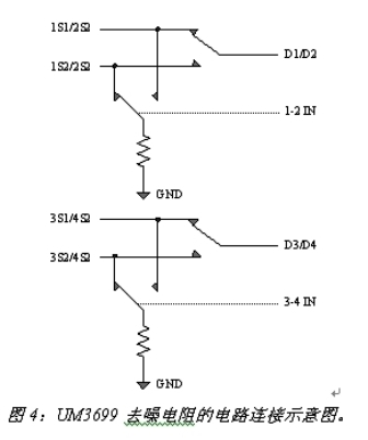 在音頻電路中,當模擬開關斷開時,由于寄生電容和電容失配,電容上的電荷無法釋放,從而導致耳機上的噪聲??梢酝ㄟ^在開關斷開時接通一個去噪電阻,來快速釋放電荷,從而提高音頻切換質量。圖4是英聯電子的UM3699在開關切換時去噪電阻的連接示意圖。