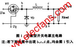 一般來講,正激型開關電源主電路可用圖1所示的降壓斬波器簡化表示,Ug表示控制電路的PWM輸出驅動信號。根據選用不同的PWM反饋控制模式,電路中的輸入電壓Uin、輸出電壓Uout、開關器件電流(由b點引出)、電感電流(由c點引出或d點引出)均可作為取樣控制信號。