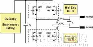 為了要同時把諧波和功率損耗降到最低,逆變器的高側IGBT利用了脈寬調制(PWM),同時低側功率器件就用60Hz進行變化。通過把PWM頻率定在20kHz或以上操作,高側IGBT有50/60Hz調制,輸出電感器L1和L2便可以保持實際可行的較少尺寸,提供有效的諧波濾波。再者,逆變器的可聽聲也可以降到最低,因為開關頻率已經高于人類的聽覺范圍。
