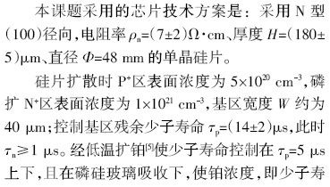 本課題采用的技術方案是在電焊機專用大電流密度整流二極管的科研成果[4]的基礎上,如單晶的選取、擴散方法和技術要求、多層金屬化的歐姆接觸、臺面噴砂造型和聚酰亞胺鈍化保護、管殼設計等大都是直接借用過來的,并且是經過改進的方案研制的,所以使整個研制工作走了捷徑。