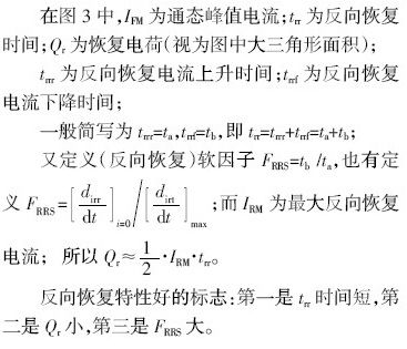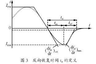 由整流二極管的國際標準知,反向恢復時間trr規定為:當從正向到反向轉換時,從電流過零瞬間起,至反向電流由峰值IFM減少到規定低值瞬間(如圖3 所示)的時間間隔。