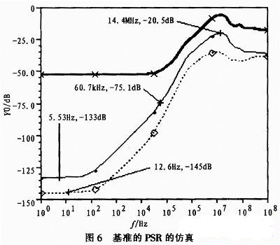 電子鎮流器的供電方式為半橋輸出接穩壓管給芯片供電,其輸出電壓為高壓正弦波(50~100 kHz),加之芯片內數字部分的干擾,這就給芯片的電源帶來較大的干擾。因此對芯片內基準的中頻PSR(Power Supply Rejection,電源抑制)有較大要求。本文從此角度在Brokaw帶隙基準的基礎上進行改進,采用LDO與基準的級聯設計來增加其PSR。