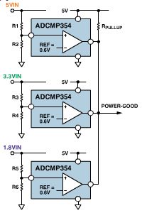 圖1 基于比較器的欠壓檢測,提供通用電源良好輸出,可用于3路電源系統