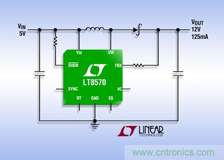 LT8570 和 LT8570-1 均可配置為升壓型、SEPIC 或負輸出轉換器。LT8570-1 更小的開關允許在較小電流的應用中使用更小的電感器。兩款器件均提供 200kHz 至 1.5MHz 可編程開關頻率,從而使設計師能夠最大限度減小外部組件尺寸。3mm x 3mm DFN 封裝 (或 MSOP-8E 封裝) 與纖巧的外部組件相結合,可確保解決方案占板面積非常緊湊,同時最大限度降低解決方案成本。