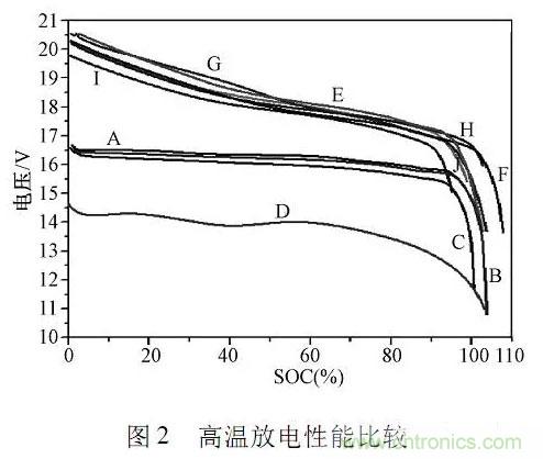 高溫情況下,電池內部離子移動速度增大,濃差極化和電化學極化減輕,極化內阻減小,電池內部化學反應熱增大,過分高溫會使隔膜發生收縮,電解液發生副反應,造成電池壽命穩定性降低GB/T31486要求電池在室溫下充滿電,55℃高溫下儲存5h后評價動力電池的放電容量電池樣品的高溫放電性能比較如圖2所示。