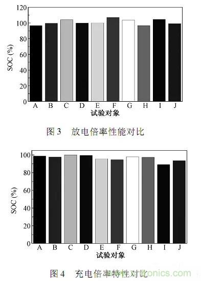 GB/T31486以動力電池在3C電流強度放電來考核其放電倍率;以2C電流強度充電,且充電時長控制在30min內,來考核電池的充電倍率特性。放電倍率特性對比如圖3所示;充電倍率特性對比如圖4所示。