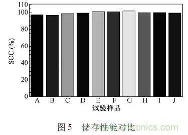 GB/T31486要求動力電池模塊充滿電,室溫下以1C放電30min后,在45±2℃下儲存28天,評價電池的容量恢復能力電池樣品儲存性能對比如圖5所示。