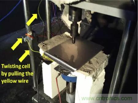 目前能夠模擬鋰離子電池內短路的方式有多種,例如針刺測試,小壓痕測試,BAJ測試和機械擠壓測試等,通過對大尺寸方形電池特點的分析,Hsin Wang認為機械擠壓測試最適合應用方形鋰離子電池的測試上。但是在傳統的擠壓的測試中由于電池受到的破壞太大,幾乎所有的電池都會發生熱失控,因此傳統的擠壓測試對不同種類電池安全性的“分辨率”就很低,只有通過和不通過兩種結果,只能對鋰離子電池的安全性進行定性分析??赡軆蓚€電池都沒有通過安全性測試,但是A電池的安全性卻要好于B電池,為了能夠準確的評估不同體系電池的安全性能,Hsin Wang對傳統的擠壓實驗進行了改進,通過在電池負極極耳上施加一個拉力,讓電池產生大約5°的扭曲,從而減少在擠壓過程中電池受到的破壞,因此該實驗能夠準確的評估不同種類電池的的安全性高低。