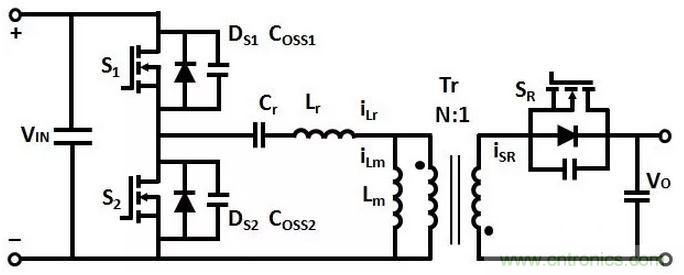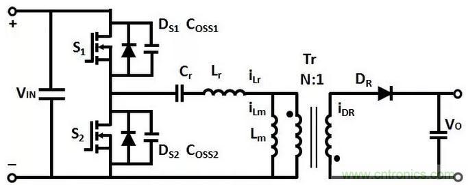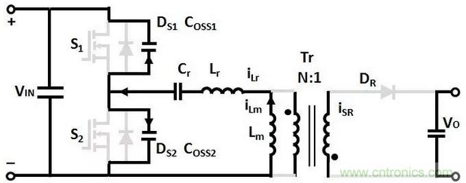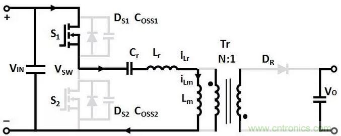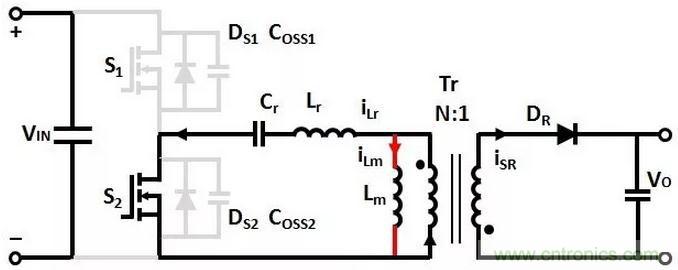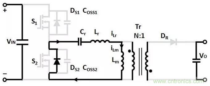 T1時刻,S1關斷,(Coss1+Coss2)和(Lr+Lm)諧振,Coss1充電,Coss2放電,直到T2時刻,Coss1的電壓充電到VIN,Coss2的電壓放電到0。